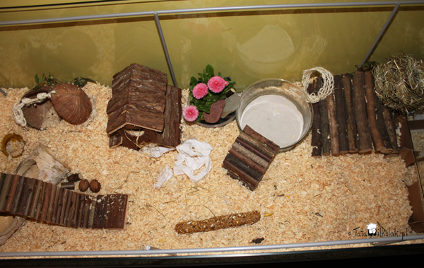 Bez zbędnego gadania: z prawej część kuchenna z poidełkiem, tak jak wcześniej ustawionym w rolce po papierze toaletowym (stabilnie stoi). Michę tradycyjną zastąpiła tacka z tworzywa sztucznego (po jakichś czekoladkach), bo i tak Peleś wszystko wywalał, a tu grzebać może do woli i nic się nie rozsypuje. Świeże kąski w szklanej miseczce na tacce. Obok małe legowisko ze starej koszulki. Całość leży na szklanej półce dołączonej do witrynki 🙂 Półka jest też sufitem dla labiryntu z kartonu, który wcisnęliśmy pod spodem. Z labiryntu wyjścia są trzy, jedno z nich prowadzi pod szeroki, drewniany mostek. Ten wyplot z siana to przykrycie do koszyczka obok. Razem są małym schowankiem wyścielonym watowatym podłożem dla gryzoni. Tą watowatą wyściółkę Pelek ma też w domku. Świetnie zatrzymuje „zapaszki”.