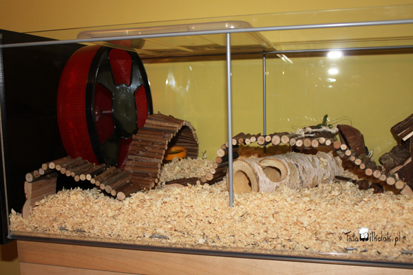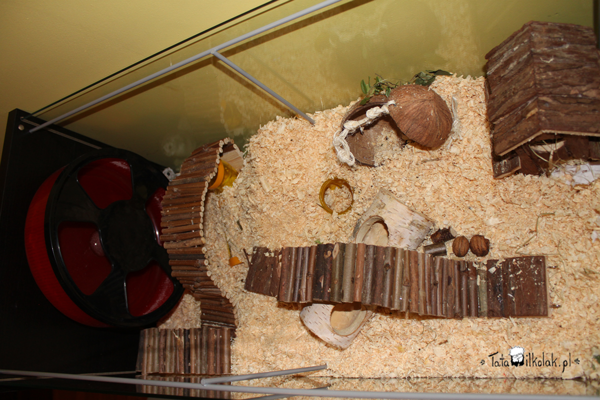 Ostatnia część to plac zabaw z kołowrotkiem, kokosem, mostkami i tunelami. Kokos kiedyś był hamakiem, teraz jest raczej schowankiem, bo nie bardzo jest na czym go zawiesić tak, żeby chomik nie zwiał. Część tuneli jest zakopana w trocinach (te plastikowe, które robią częściowo za toaletę). Jako, że Peleś dopiero się wprowadził, pilnuje tego co najcenniejsze osobiście i uwił sobie gniazdko w tunelach obok kołowrotka. Co jak co, ale kółka nie odda!
