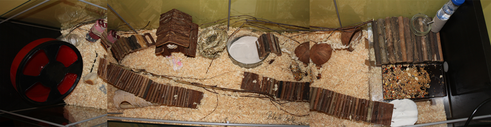 Bez zbędnego gadania: z prawej część kuchenna z poidełkiem, tak jak wcześniej ustawionym w rolce po papierze toaletowym (stabilnie stoi). Michę tradycyjną zastąpiła tacka z tworzywa sztucznego (po jakichś czekoladkach), bo i tak Peleś wszystko wywalał, a tu grzebać może do woli i nic się nie rozsypuje. Świeże kąski w szklanej miseczce na tacce. Obok małe legowisko ze starej koszulki. Całość leży na szklanej półce dołączonej do witrynki 🙂 Półka jest też sufitem dla labiryntu z kartonu, który wcisnęliśmy pod spodem. Z labiryntu wyjścia są trzy, jedno z nich prowadzi pod szeroki, drewniany mostek. Ten wyplot z siana to przykrycie do koszyczka obok. Razem są małym schowankiem wyścielonym watowatym podłożem dla gryzoni. Tą watowatą wyściółkę Pelek ma też w domku. Świetnie zatrzymuje „zapaszki”.